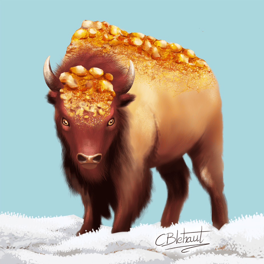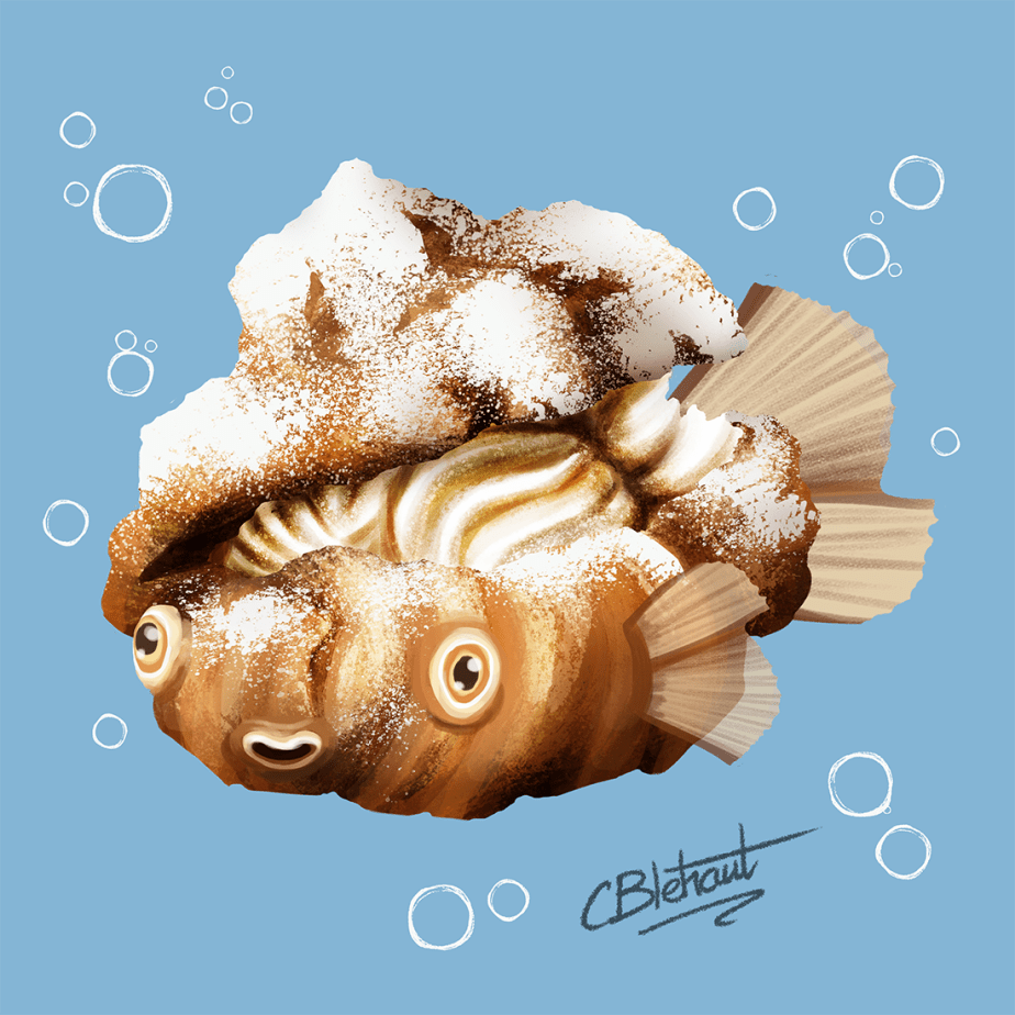 Meet the Creamfish (cream puff and puff fish hybrid) and the Cremebruison (bison and creme brulee hybrid). Cute but definitely facing extinction when discovered.